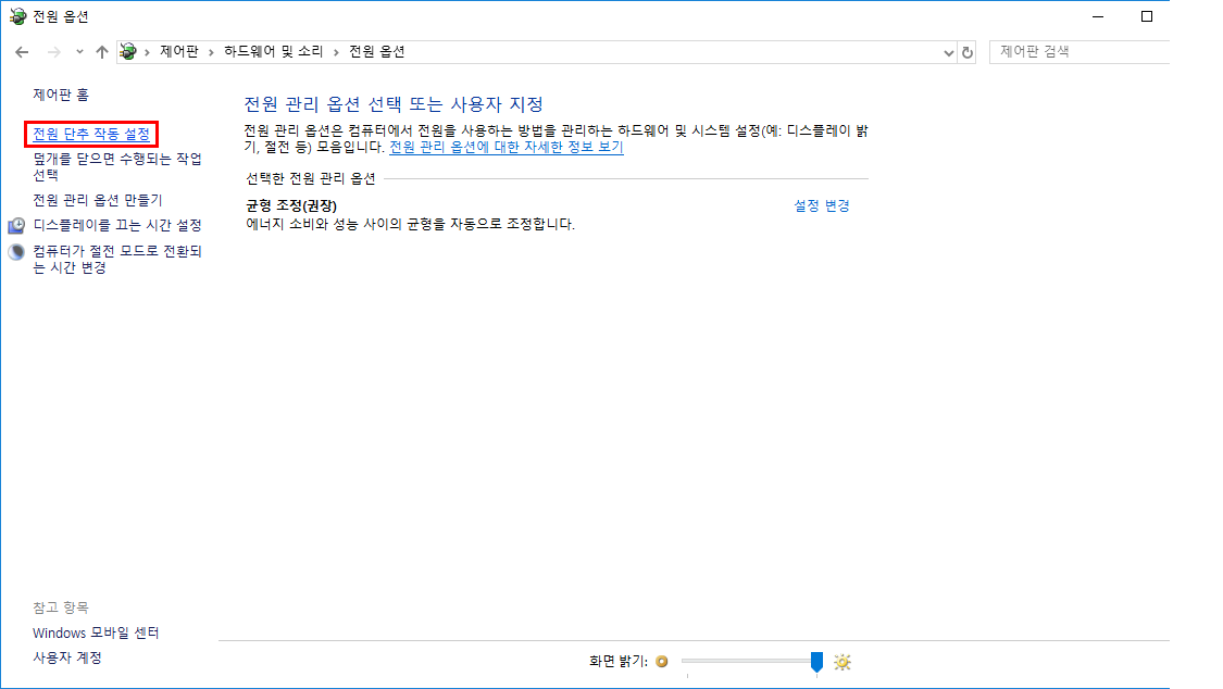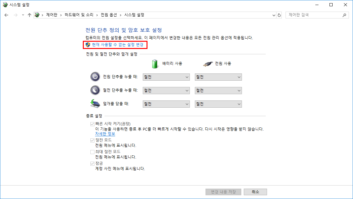 4. 현재 사용할 수 없는 설정 변경을 눌러 아래의 종료 설정 옵션을 활성화시킨다.
