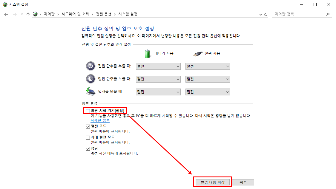 5. 아래의 화면과 같이 종료 설정 옵션을 선택할 수 있도록 활성화됐다. 이때, 빠른 시작 켜기(권장)에서 선택을 해제한다. 그런 다음, 변경 내용 저장 버튼을 눌러 설정을 저장한다.