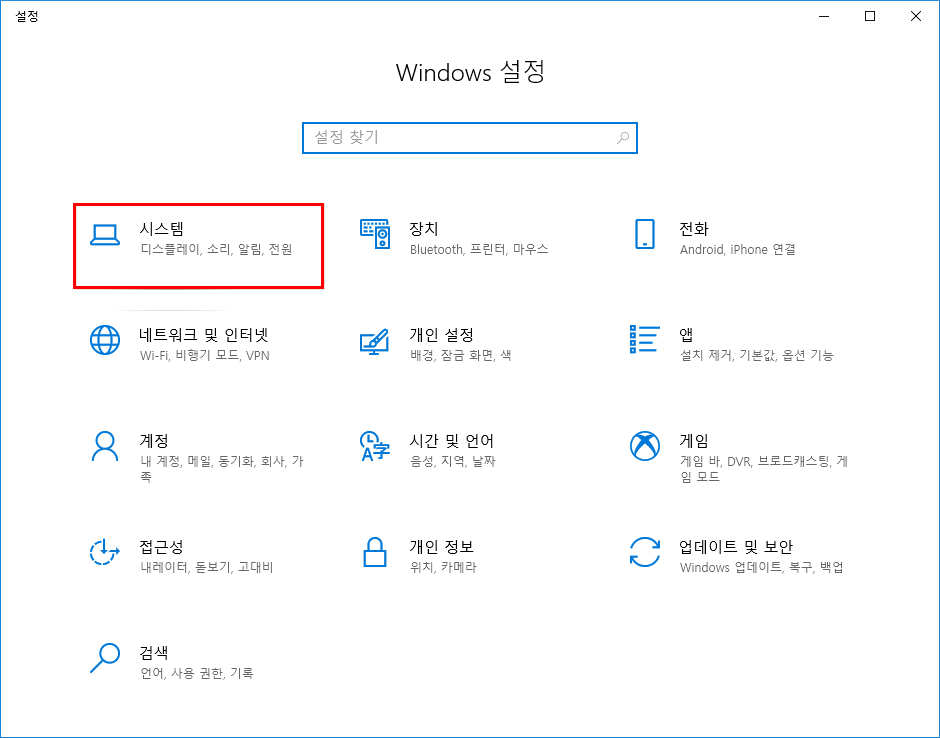 1. 윈도우 키와 I 키를 눌러 Windows 설정 화면을 열어 시스템을 클릭한다.