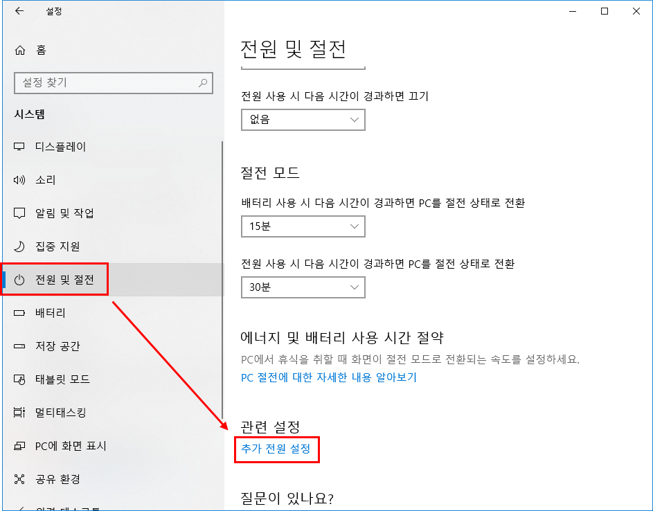 2. 전원 및 절전을 누른 다음 우측에서 추가 전원 설정을 누른다.