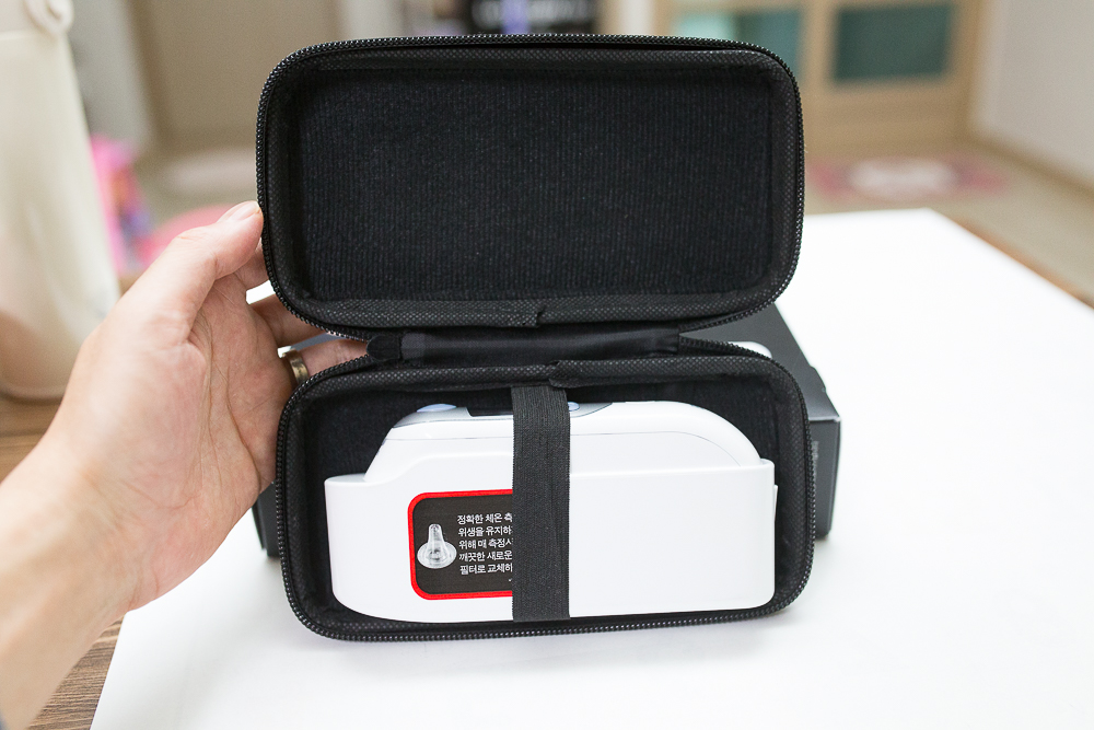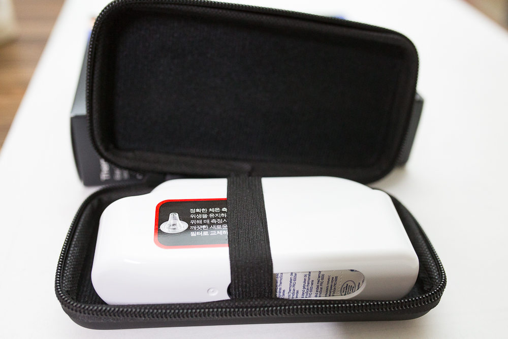 검은색 하드케이스에 체온계 본품을 넣은 장면입니다. 검은색 하드 케이스는 제품을 구입하실 때, 포함되어 있는지 아닌지를 미리 확인하셔야 합니다. 주는 곳도 있고, 아닌 곳도 있습니다만, 제가 확인한 바로는 검은 하드 케이스를 제공하는 제품이 더 비쌌습니다.