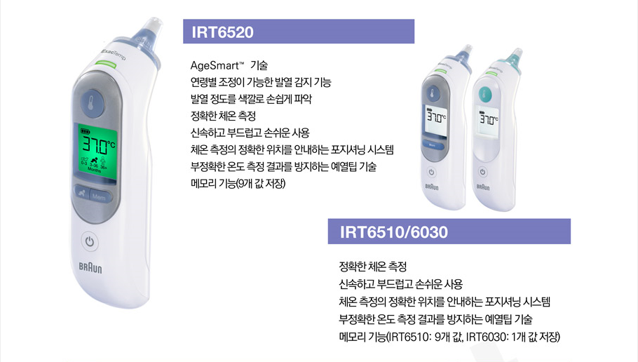 브라운 Thermoscan 7, IRT6520 제품은 대표적인 접촉식 체온계 제품으로서 이미 세계적으로 정평이 나 있습니다. 그리고, 신생아 뿐만 아니라 그 누구에게라도 필요한 것인 만큼 집에 하나씩은 반드시 구비해야 하는 제품이지요. 동사의 6510 모델은 연령 선택이 없습니다. 체온계를 켤 때 마다 연령을 선택할 필요 없다는 점을 장점으로 강조하는데, 그럴 것이면 6520 제품에는 왜 그 기능을 넣어 두었는지 이해가 안됩니다. 굳이 돈 만원 이상을 더 주고 6520 모델을 살 필요는 없습니다만, 얼마 차이 나지 않는데 굳이 모자란 기능의 제품을 살 이유도 잘 모르겠네요. 가장 저렴한 라인업인 6030에는 메모리 추가 기능도 연령 선택 기능도 없습니다. 오로지 체온 측정만 가능하네요.