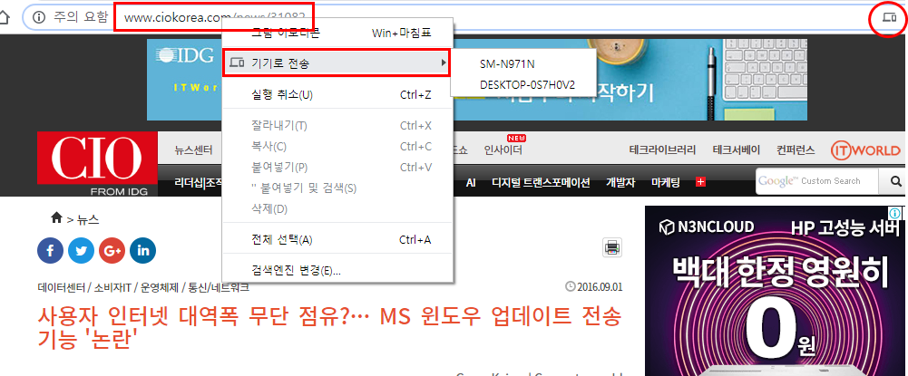 우선 두 대 이상의 장비에 동일한 계정으로 구글에 로그인을 한다. 위의 사진에서 처럼 주소 위에서 마우스 우클릭을 하거나, 주소창 우측에 놓여진 그림을 눌러 원하는 기기로 웹 주소를 전송할 수 있다.
