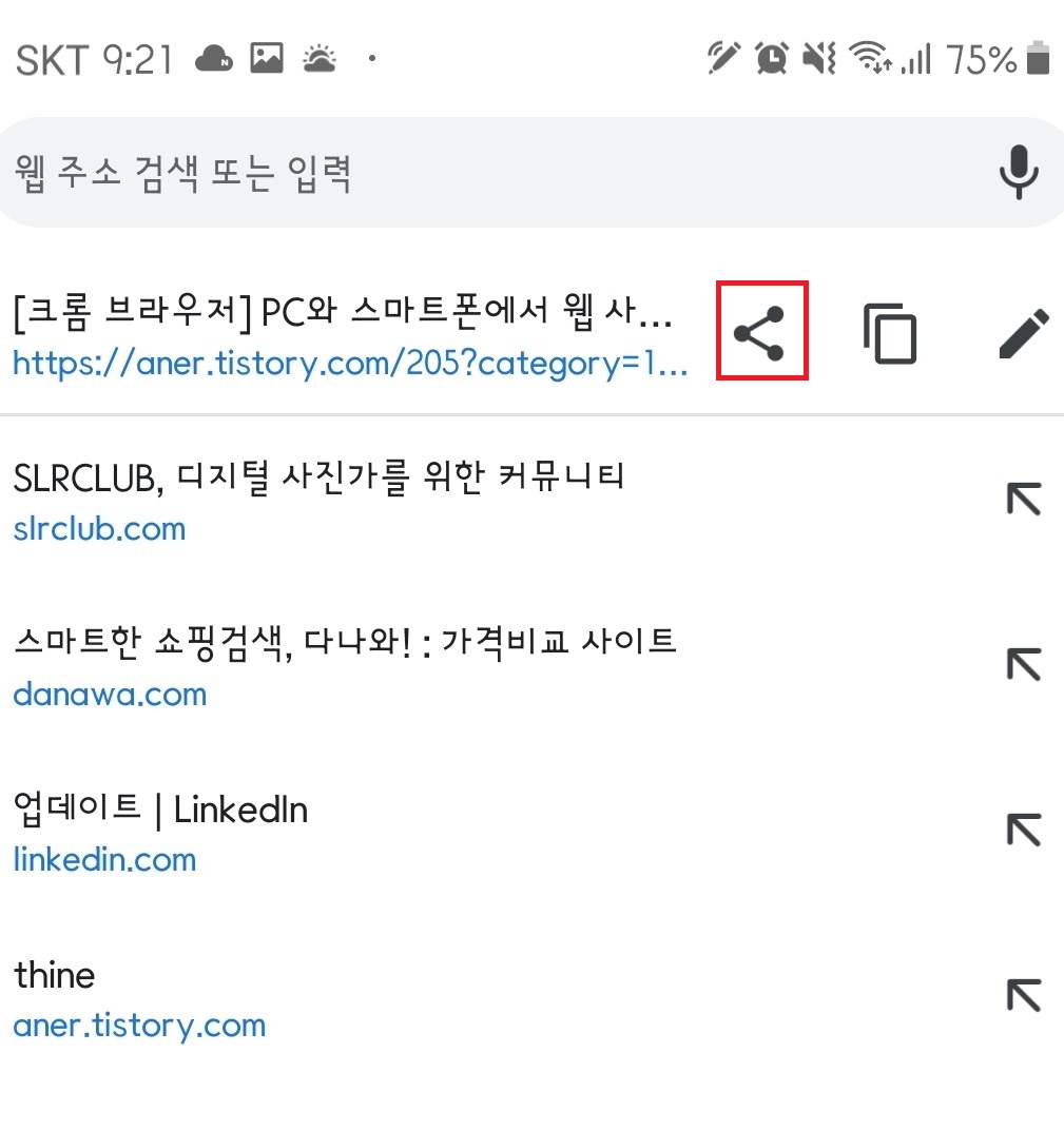 모바일 크롬에서 주소창을 클릭하면 위의 화면이 나타난다. 이때, 빨간색 상자 안에 표시된 공유 버튼을 누른다.