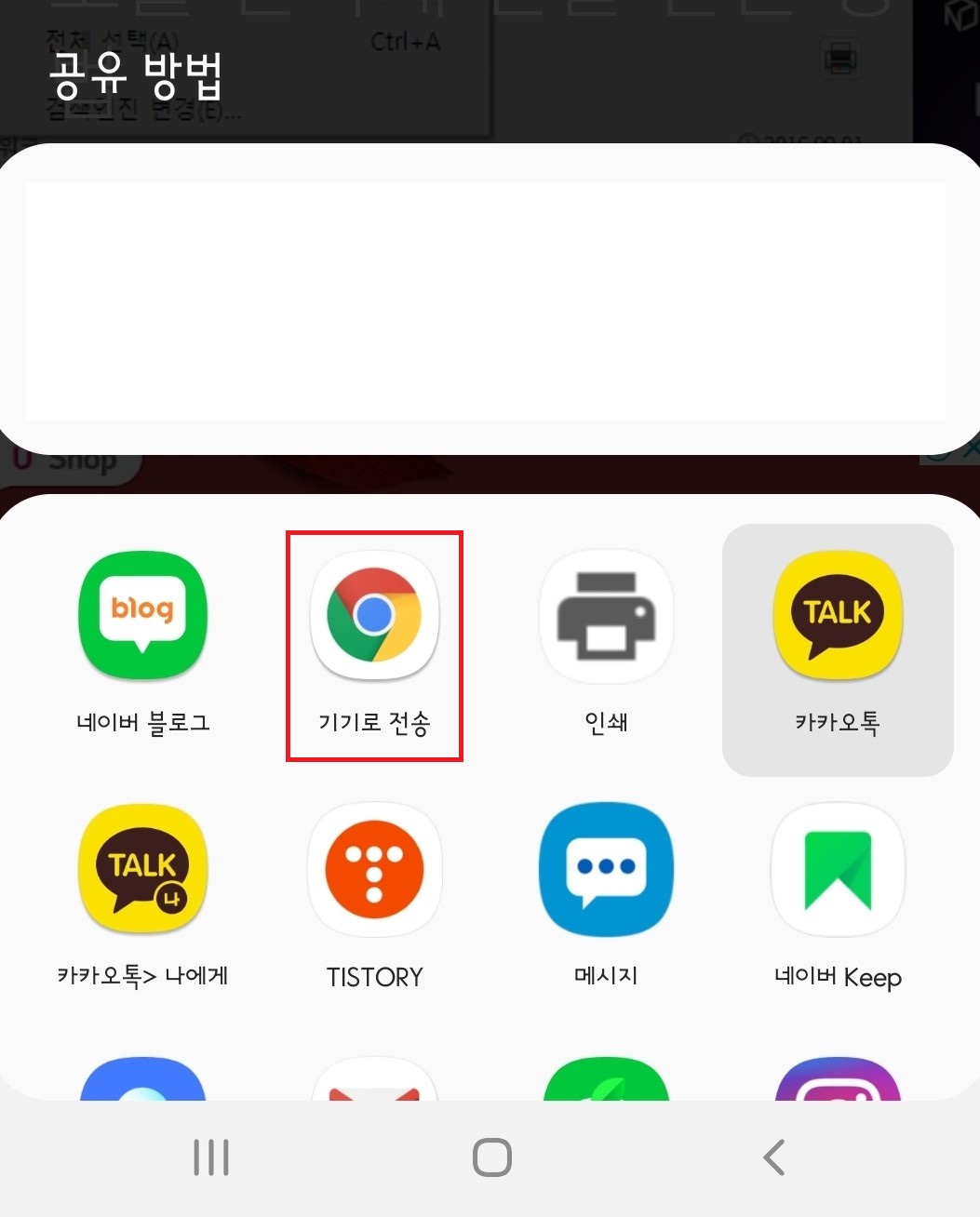 다양한 경로를 통해서 웹 사이트 주소를 공유할 수 있는데, 그중에서 기기로 전송을 선택한다. 역시, 모바일 기기와 PC에서 접속한 구글 계정이 같아야 서로 주고 받을 수 있다.