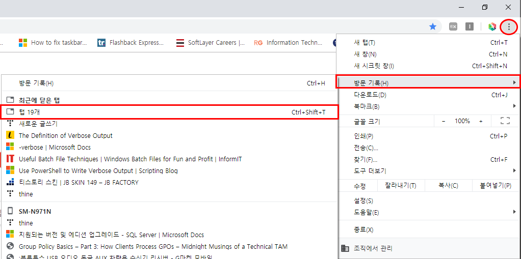 위의 사진 하나로 모두 설명이 가능하다. 우측 상단에 위치한 점 세 개의 아이콘을 클릭한 다음, 풀 다운 메뉴가 나타나면 방문 기록을 클릭한다. 마우스 클릭 없이 곧장 Ctrl+H 키를 눌러도 된다.