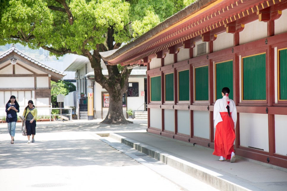 신사가 눈앞에 있음을 알리는 커다란 석문이 인상적이다. 대게 일본 신사 입구에는 빨갛게 칠해진 목조식 문이 놓여 있다.