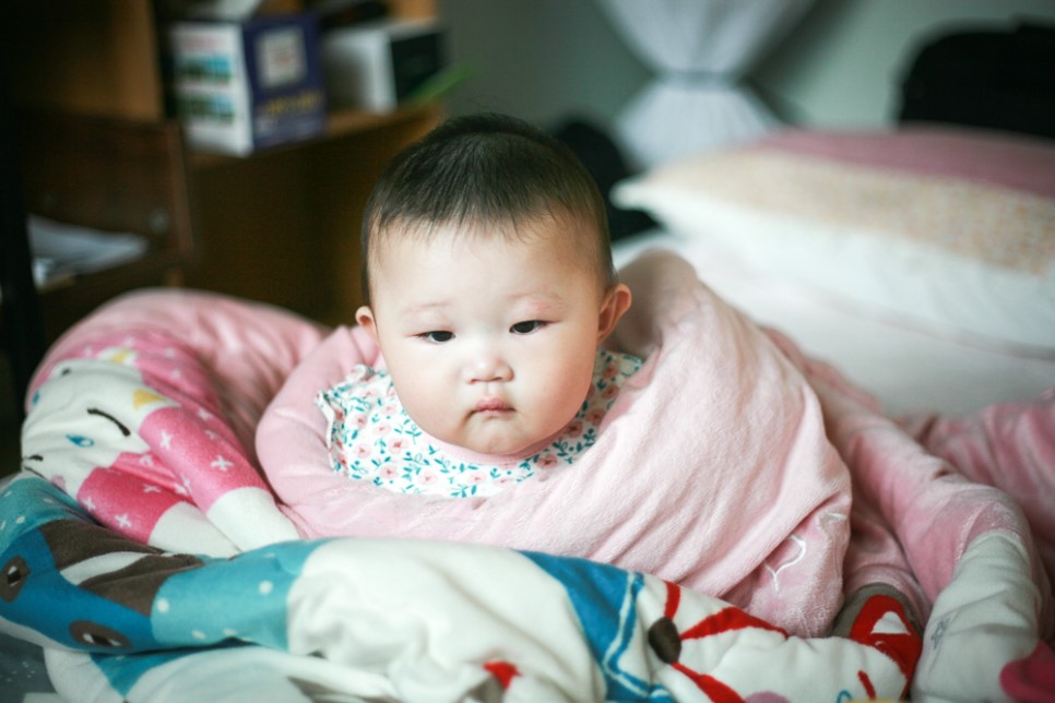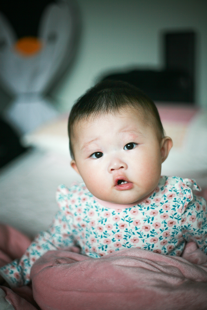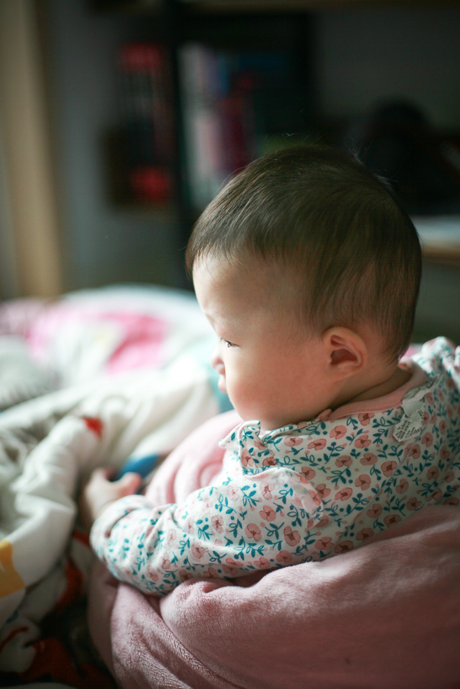 호기심을 자극할만한 것을 발견했는지, 손을 뻗어 집으려 하지만 어림없다. 아직 푹신한 바닥에서 힘을 줘서 자세를 바꾸기에는 역부족이다. 게다가, 온몸을 칭칭 두른 이불이 바리케이드 역할을 하고 있다. 이 모습을 담으려는 나를 발견한 아이는 이내 시선을 맞추고 있었다.