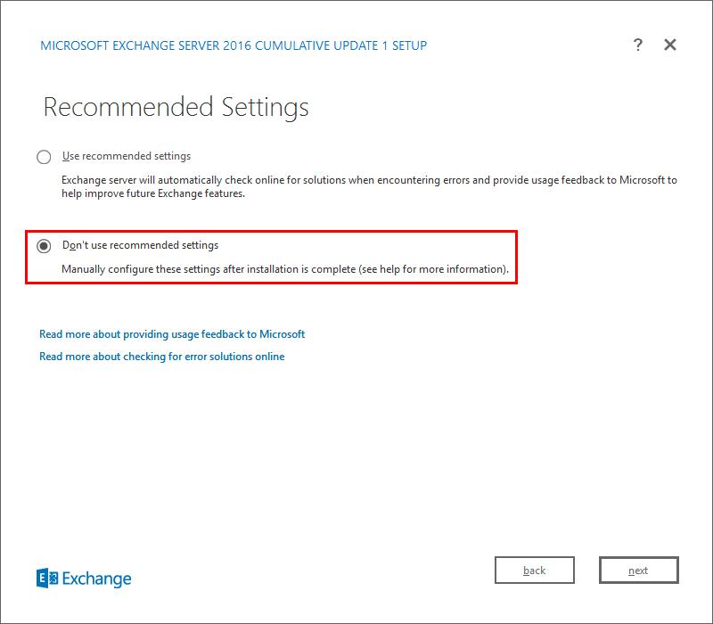 참고사항 : Use recommended setting 를 선택하면, 오류가 발생했을 때, 온라인 상에서 해결 방법을 익스체인지 서버가 자동으로 확인하고, 해당 기능에 대한 피드백을 마이크로소프트에 전송을 한다. 따라서, 해당 옵션을 선택하는 사람은 무심결에 다음 버튼을 누르지 않는 이상, 거의 없을 것이다.