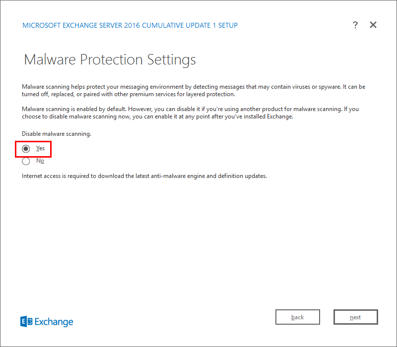 8. 멜웨어 스캐닝 비활성화 (Yes)를 선택 후, 다음을 눌러 계속 진행 한다.