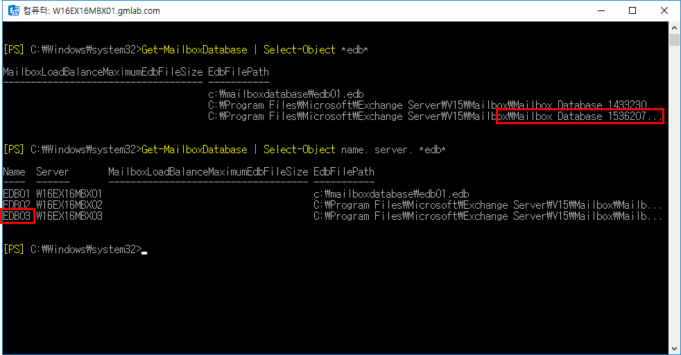 아래의 화면은 메일박스 데이터베이스의 이름은 EDB03 이지만, 데이터베이스 파일의 이름은 Mailbox Database 1536~ 으로 되어 있다. 데이터베이스의 이름을 파일명에 맞추던지, 파일명을 데이터베이스 이름과 맞추던지 해야한다.