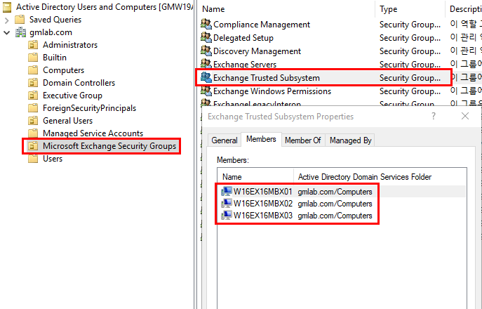 1. Active Directory 사용자 및 컴퓨터에서 Microsoft Exchange Security Groups OU를 클릭한 다음, Exchange Trusted Subsystem 그룹에 DAG 및 복제본을 구성할 컴퓨터 계정을 구성원으로 추가한다.