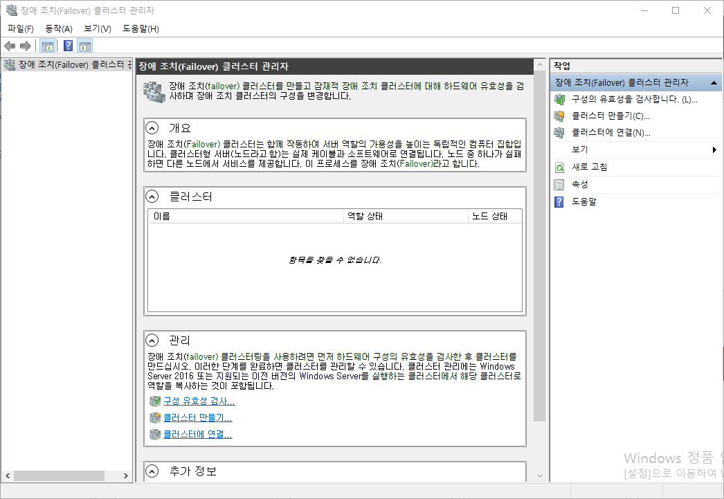 참고사항 : DAG 가 구성이 된 후, 관리 도구에서 장애 조치(Failover) 클러스터 관리자를 실행해도, 그 어떤 구성도 되어 있지 않다. 그러나, 반드시 Cluster Service 가 실행되고 있어야만 DAG 및 복제본 운영이 정상적으로 동작한다.