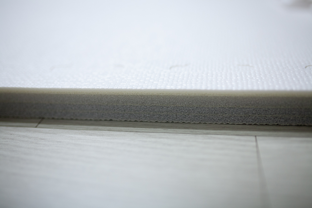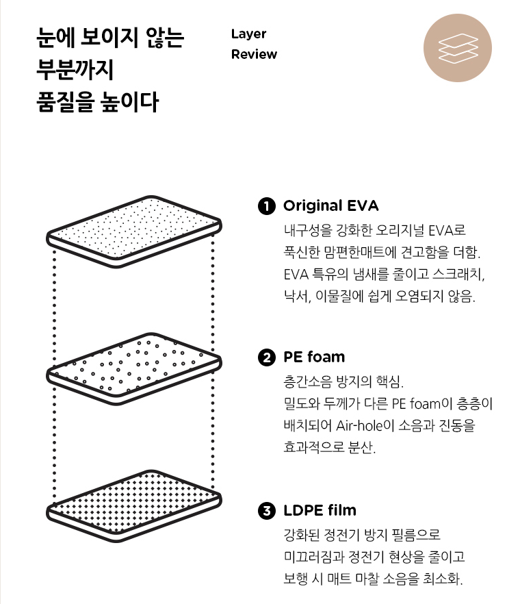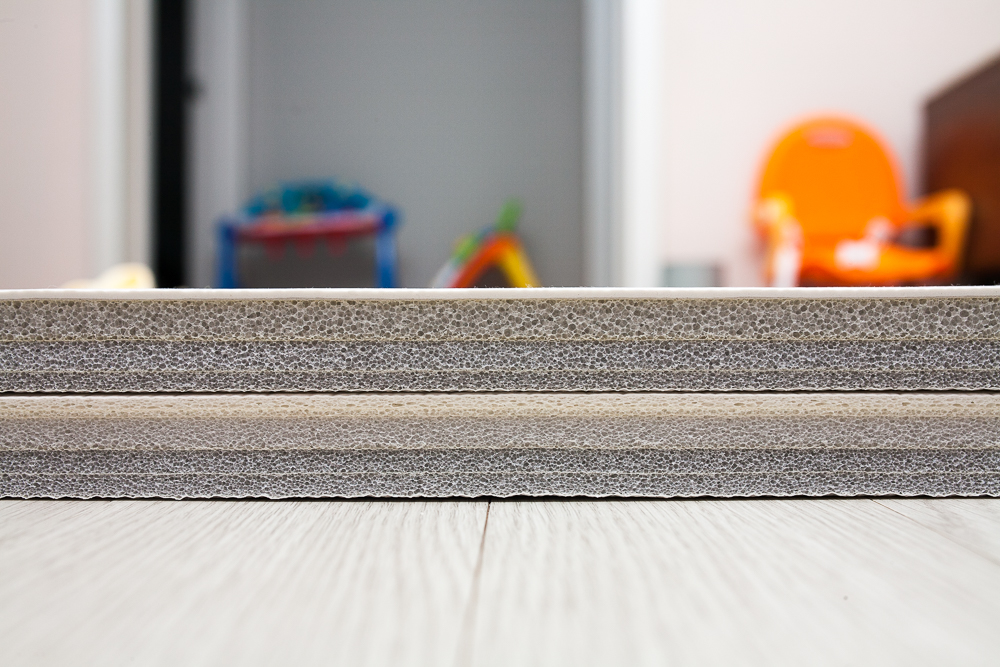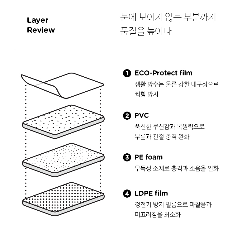 프리미엄 매트의 단면. 총 4 계층 설계로 생활 방수, 복원력, 충격 완화 등의 층간소음 매트에 필요한 모든 성능을 담았다고 볼 수 있다. 게다가, 바닥과 밀착이 잘 이루어지다 보니 밀리는 일은 조금도 없다.