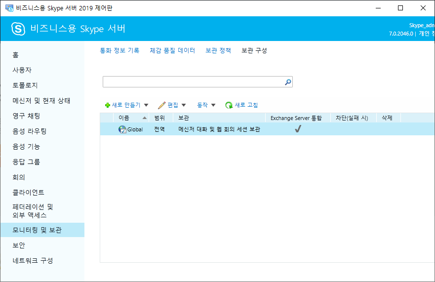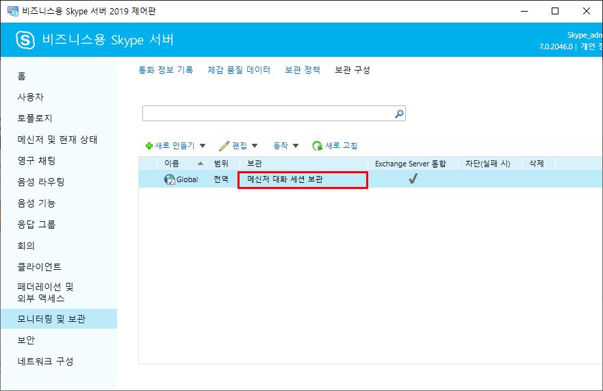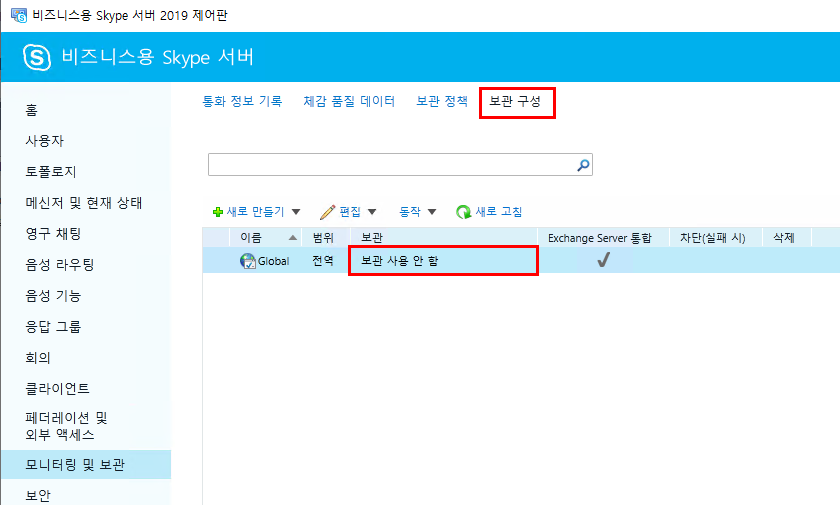 제어판에서 메신저 대화 세션 보관 정책을 적용했음에도 위에서 보는 것과 같이 사용자 옵션은 체크가 해제되고 항목도 선택할 수 없게 되어 있다. 제어판 보관 구성과 파워셸 정책 적용과의 상관 관계를 확인하기 위해서 한 차례 더 테스트를 진행 해보겠다.