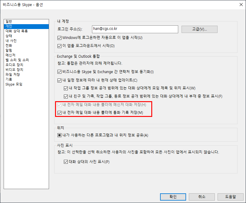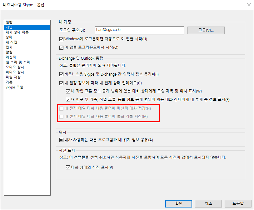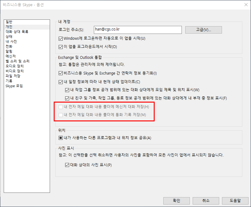 역시, 제어판 구성값은 파워셸로 적용한 구성값에 어떠한 영향도 미치지 않는 것을 확인했다. 내 전자 메일 대화 내용 폴더에 메신저 대화 저장 옵션이 선택된 채로 사용자가 구성을 변경할 수 없도록 회색 처리가 되어 있다.
