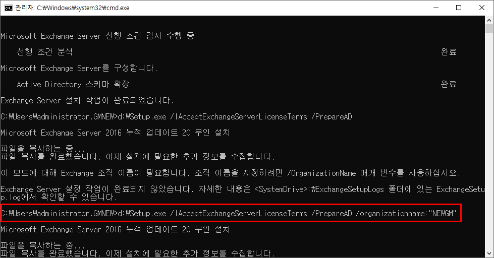 이때 이미 스키마 준비 단계와 AD 도메인 준비 단계를 거쳤으므로 E:\Setup.exe /IAcceptExchangeServerLicenseTerms 명령만 수행해도 된다. 조직의 이름과 도메인 서버 또는 Exchange Server 가 설치될 도메인을 바꿀 생각이 아니라면 말이다.