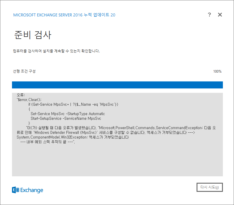 이미 마이크로소프트 Docs 에서 Exchange Server 2016은 윈도우 서버 2019 환경을 지원하지 않는다는 사실을 확인했으나, 별도로 확인해 볼 필요가 있어서 부득불 설치를 진행했으나, 아래와 같은 오류가 발생하며 더 이상 설치가 진행되지 않았다.