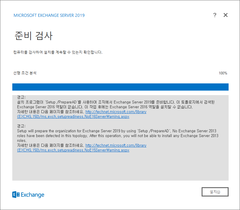 윈도우 서버 19 환경에서 Exchange Server 2016 설치에는 오류가 발생한다는 것과 스키마 및 AD 구성 값에 변화가 나타난 것을 확인 후, Exchange Server 2019 설치 마법사를 실행했다. 아무런 문제 없이 위 사진과 같이 준비 검사를 통과한 것을 확인할 수 있었다.