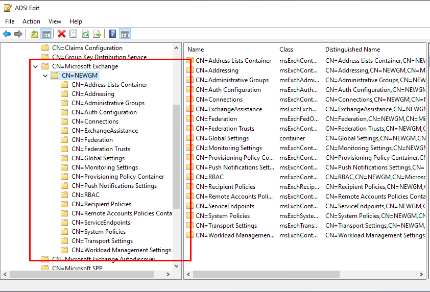 위 준비 검사 단계에서 실패 하자마자 AD 서버에서 ADSIEDIT를 실행 후, 구성 정보를 확인해 보았다. 빨간색 상자에서 보듯 설치에는 실패했으나 AD에는 이미 Exchange Server 설치에 필요한 컨테이너가 생성된 것을 확인할 수 있었다.