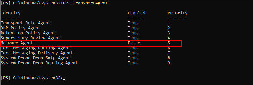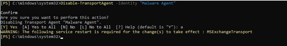 PS> Disable-TransportAgent -Identity "Malware Agent"