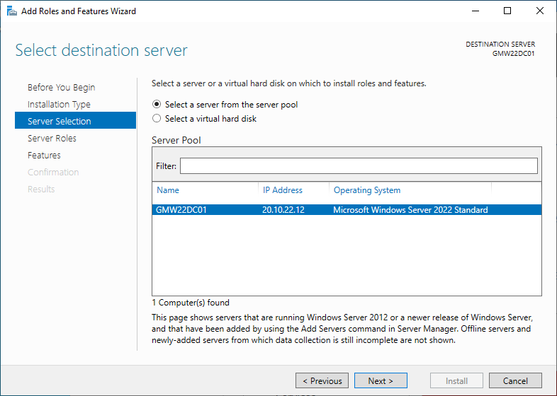 4. Active Directory를 설치할 서버를 선택한 후, Next를 클릭한다.