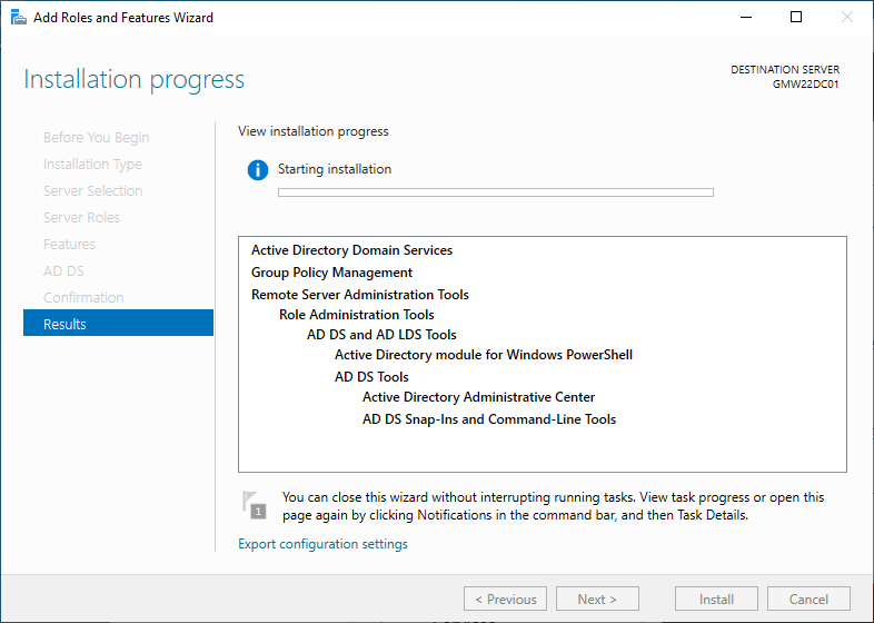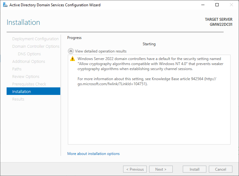 19. Install을 클릭하여, DNS 설치 및 도메인 컨트롤러 구성을 진행한다.