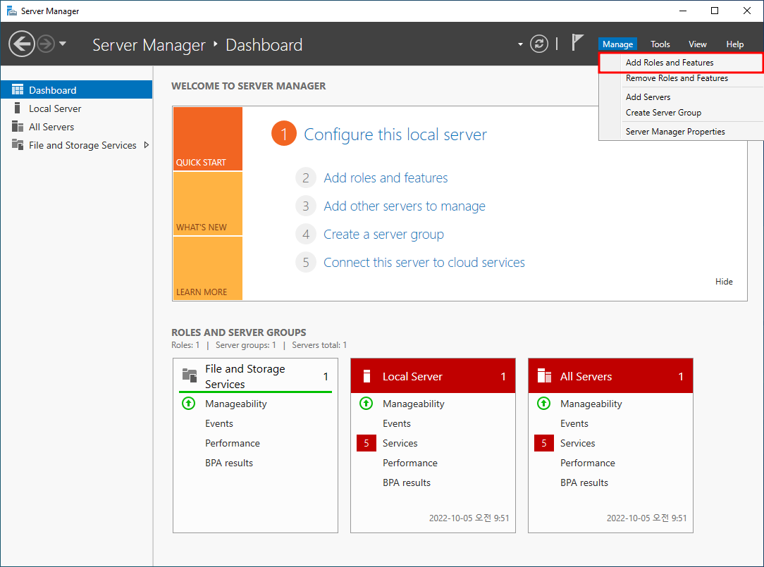 1. Server Manager 화면의 우측 상단에 위치한 Manage를 클릴 후, Add Roles and Features를 클릭한다.