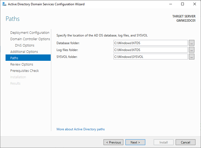 17. Active Directory Database 및 GPO 정책 등의 정보를 담은 SYSVOL 폴더를 기본값으로 두고 Next를 클릭한다.