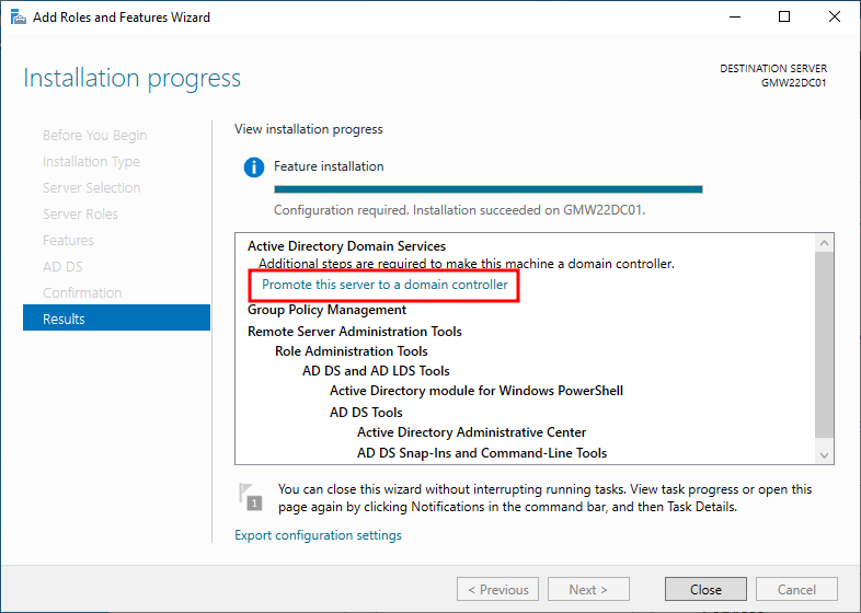 12. Active Directory Domain Service 설치가 완료되었다는 화면은 아래와 같다. Promote this server to a domain controller 를 클릭하여, 도메인 컨트롤러를 구성단계로 진행한다.