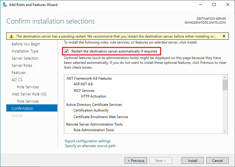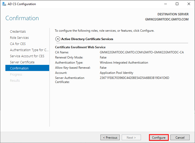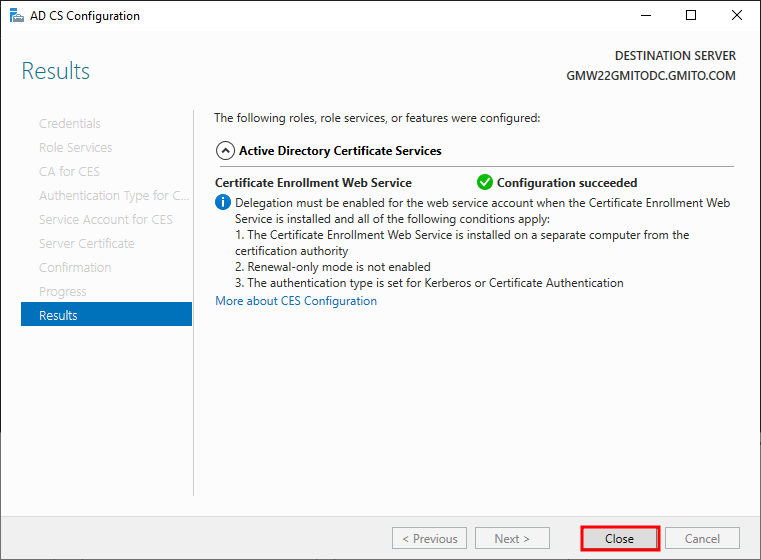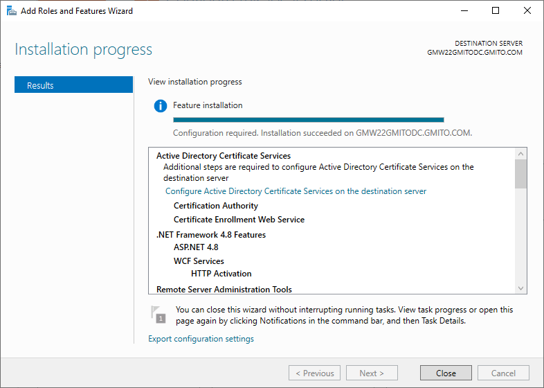 14. 역할 설치가 완료되었다. 상자 안의 현재 서버에 ADCS 서비스를 구성하기를 누른다.