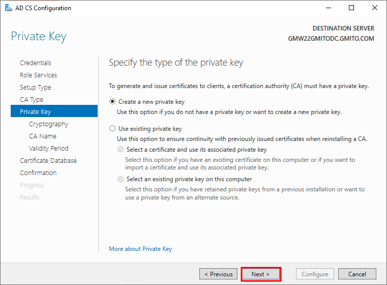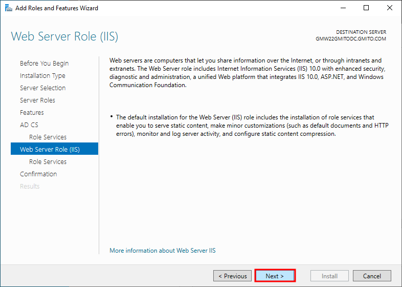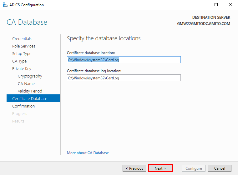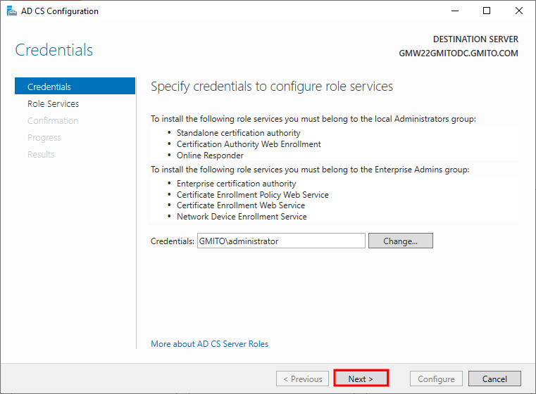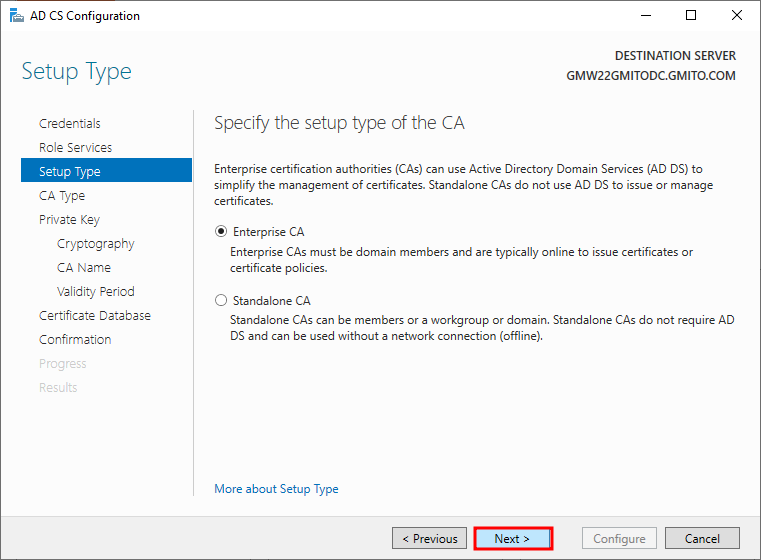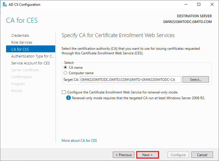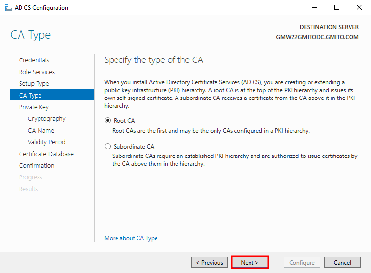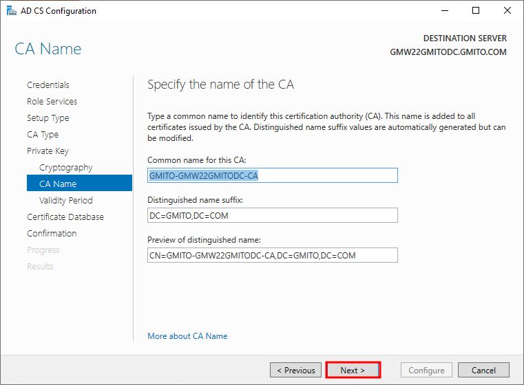 7. 이미 Active Directory가 구성된 서버에서 CA를 구성했다. 따라서, 기본적으로 DC의 정보를 불러 온다. 읽어 보고, 다음을 눌러 계속 진행한다.