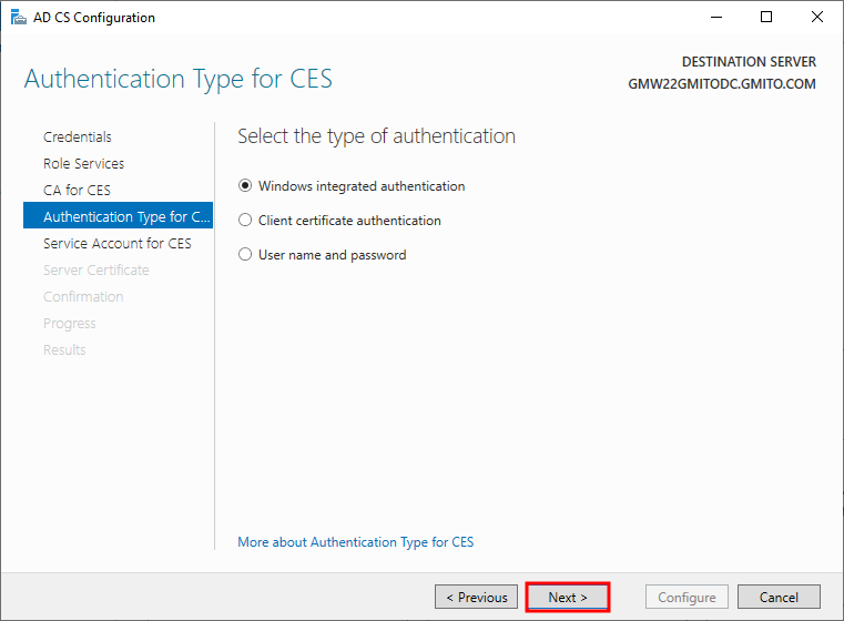 15. 인증서 등록에 필요한 인증 방식을 선택한다. 기본값인 윈도우 통합 인증 방식을 선택 후, 다음을 누른다.
