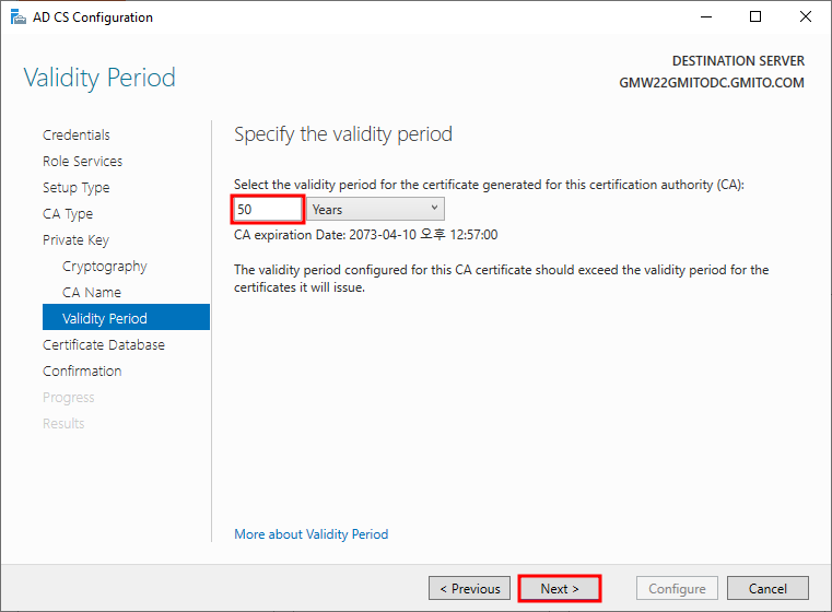 8. CA 인증서의 유효 기간을 50년으로 바꾸어 주었다. 서버를 교체한다던가 하는 이유가 발생하지 않으면, 50년간 계속해서 쓸 수 있다는 의미이다.