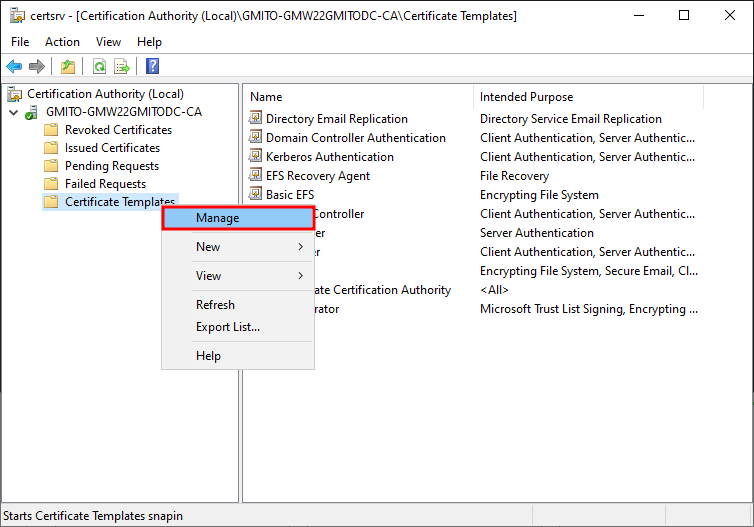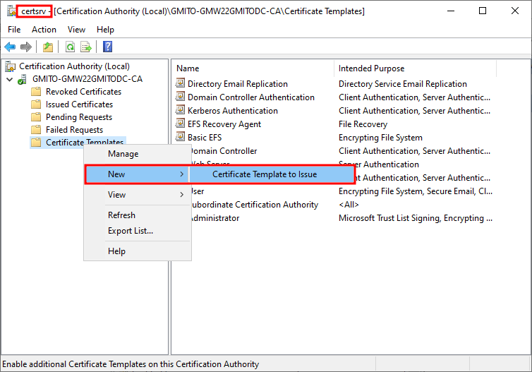 6. 다시 인증서 서버 (certsrv.mmc) 콘솔에서 인증서 템플릿을 우클릭하여 새로운 인증서 발급을 진행한다.