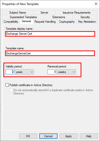 4. 일반 탭에서 템플릿의 표시 이름과 템플릿 이름을 각각 입력한다. 그런 다음, 인증서의 사용기한과 갱신 주기를 입력한다.