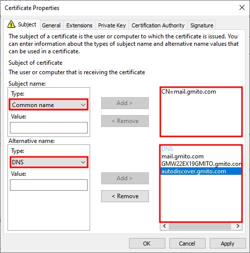 13. 아래의 화면과 같이 드롭다운 메뉴를 선택 후, 필요한 도메인 이름을 입력한다. Common name과 Alternative name은 각각 인증서의 주체 / 대체 역할을 한다.