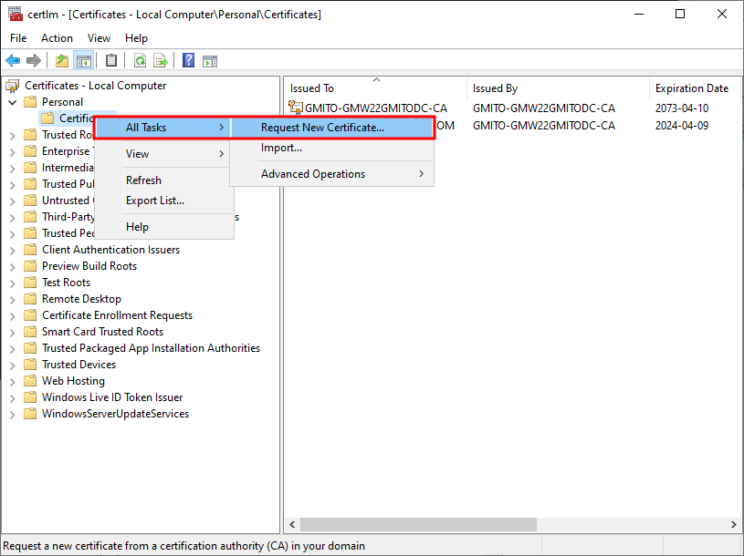 9. 개인 인증서 목록에서 우클릭 후, 새로운 인증서 요청을 클릭한다.