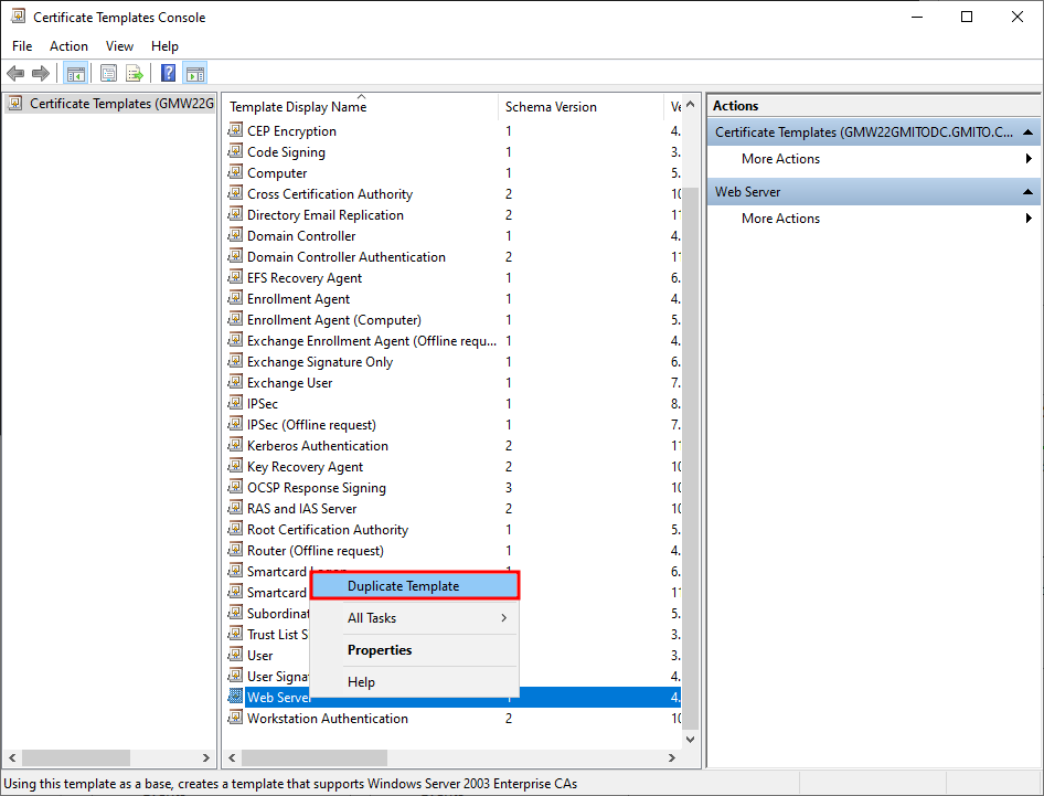 3. MMC 콘솔의 화면이 바뀐 것을 알 수 있다. 아래 화면처럼 Web Server 템플릿을 우클릭한 후, 템플릿 복제를 누른다.