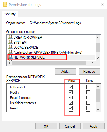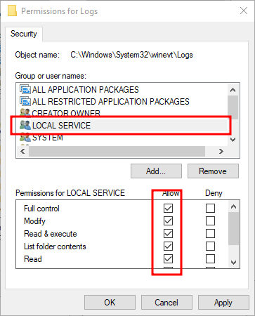 Logs 폴더를 우클릭하여 보안 탭을 열어, 위와 같이 Local Service, Network Service 계정을 추가하고, 모든 권한을 부여한다.