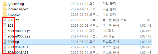 복구를 위해서는 현재 로그를 알아야 한다. 인터넷을 뒤져서 나오는 화면을 보고 무작정 e00 를 입력하는 사람들이 있을 수 있다고 생각한다. 그러나, 실제 복구를 위해 필요한 현재 로그가 무엇인지는 로그가 저장되는 경로에서 직접 확인하는 것이 좋다. E08 파일과 E08로 시작하는 무수한 파일들이 있다. E08의 Checkpoint가 완료되면 다음에 생성되는 번호는 당연히 E09다.