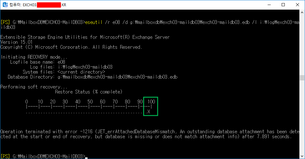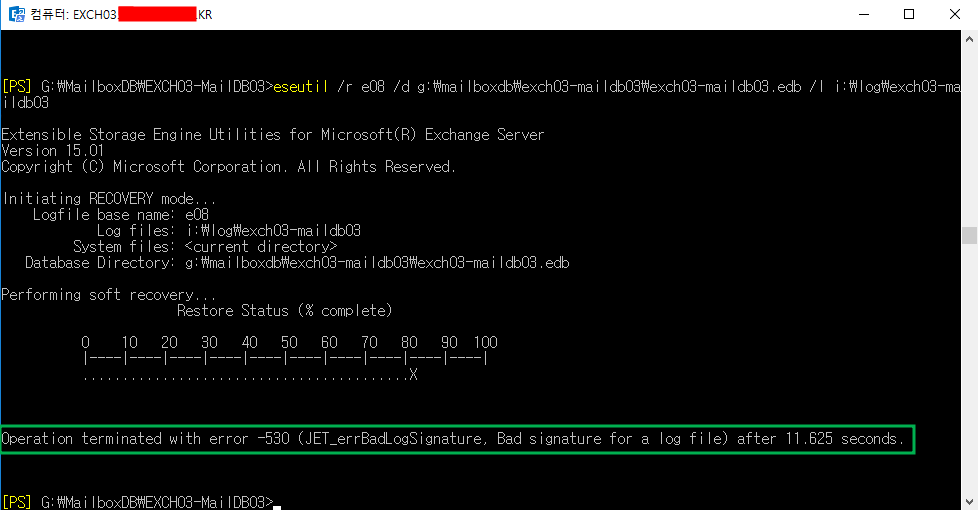 베이스 로그를 확인한 다음 과정을 수행했다. 역시, eseutil 명령어로 Soft 복구를 실행한다. 실제 수행한 화면은 아래와 같다.