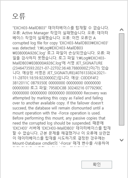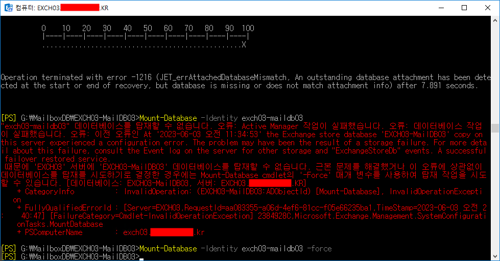 위 Spiceworks 를 참고한 이후, 데이터베이스 마운트를 시도해보았지만, 실패. 그래서 다시 -Force 모드로 해서, 마운트를 성공하게 된다.